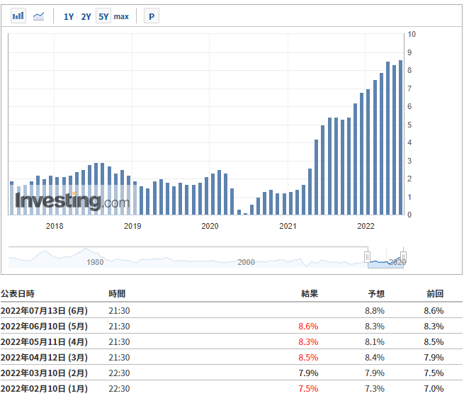 CPIの予想は下記のように8.8%で